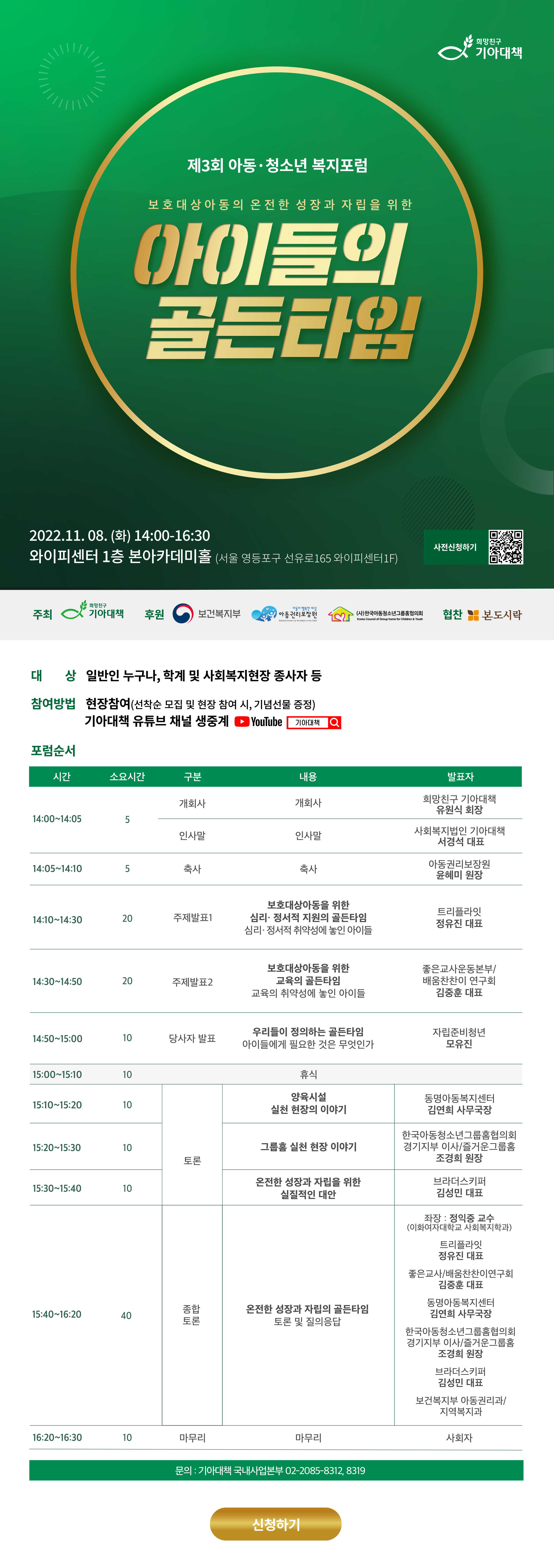 올해 『제 3회 아동·청소년복지포럼 보호대상아동들의 온전한 성장과 자립을 위한 "아이들의 골든타임』을 개최합니다.
